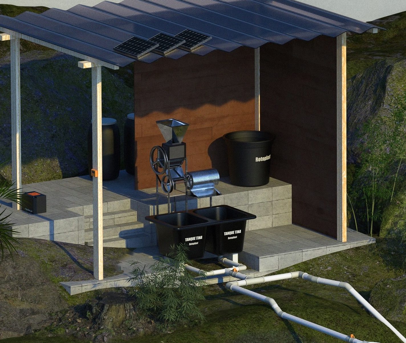 At the same time, coffee pulp is composted within the system, turning waste into soil-enriching material instead of pollution.
